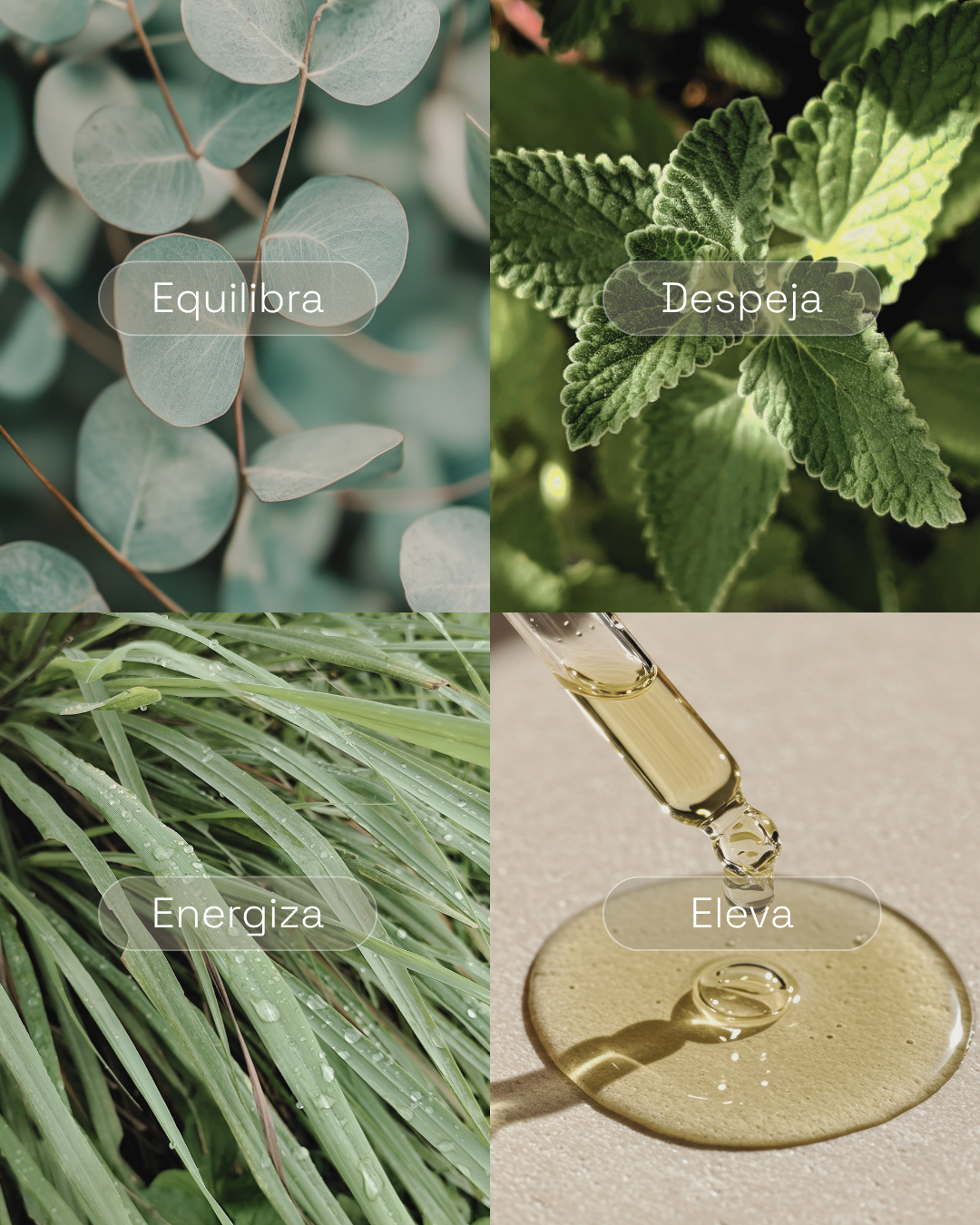 El aceite esencial de eucalipto aporta un frescor herbal que favorece la respiración clara y la concentración.